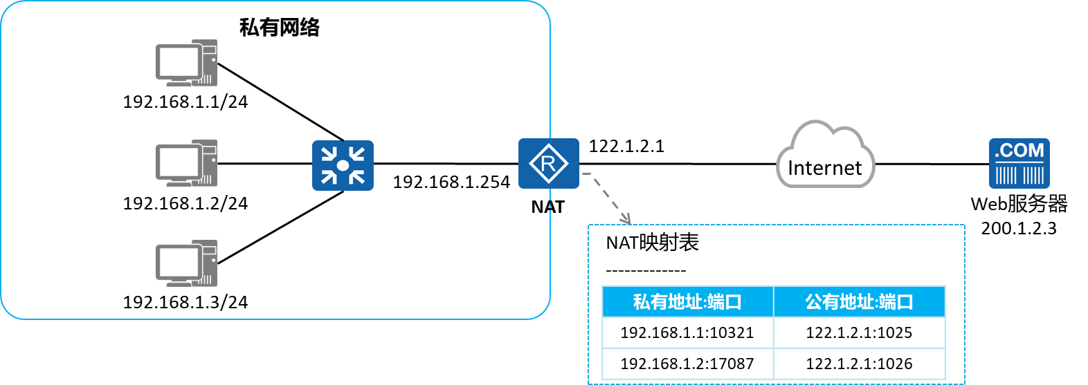 而在Easy IP中,可以直接使用接口本身的地址进行地址+端口的转换。从而实现只需要一个公网地址就可以进行私网访问公网的操作。